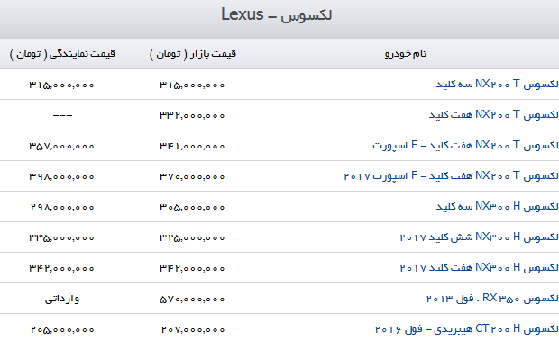 به گزارش خبرنگار نبض بازار گروه اقتصادی باشگاه خبرنگاران جوان قیمت برخی از مدل های خودروی لکسوس در بازار و از درب نمایندگی به شرح زیر است: انتهای پیام/