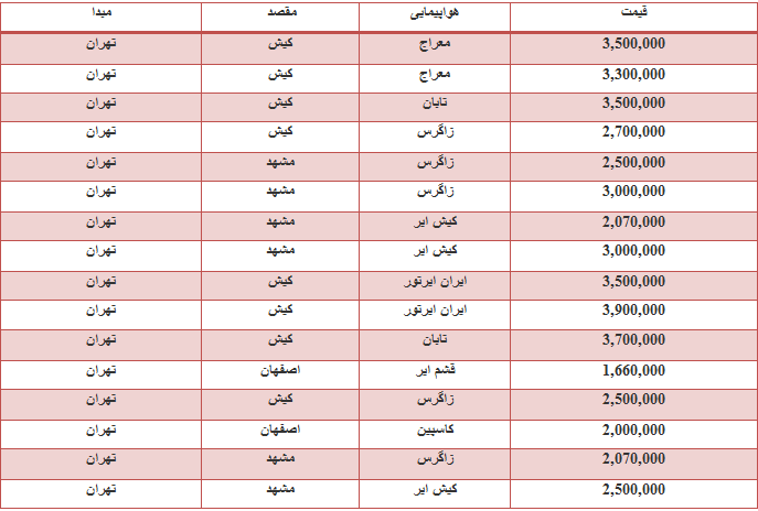 به گزارش خبرنگار نبض بازار گروه اقتصادی باشگاه خبرنگاران جوان، قیمت انواع بلیت هواپیما از تهران به برخی از شهر ها در کشور به شرح زیر است: انتهای پیام/ آخرین نرخ بلیت هواپیما از تهران