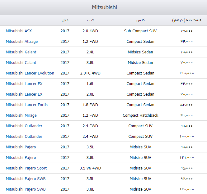 به گزارش خبرنگار نبض بازار گروه اقتصادی باشگاه خبرنگاران جوان،  قیمت انواع محصولات خودرو  میتسوبیشی در بازار دبی به شرح زیر است:                 انتهای پیام/ آخرین قیمت خودرو های میتسوبیشی در بازار دبی