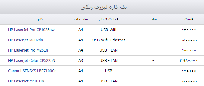 به گزارش خبرنگار نبض بازار گروه اقتصادی باشگاه خبرنگاران جوان، قیمت انواع پرینتر تک کاره لیزری رنگی در بازار به شرح زیر است: انتهای پیام/ آخرین قیمت پرینتر در بازار