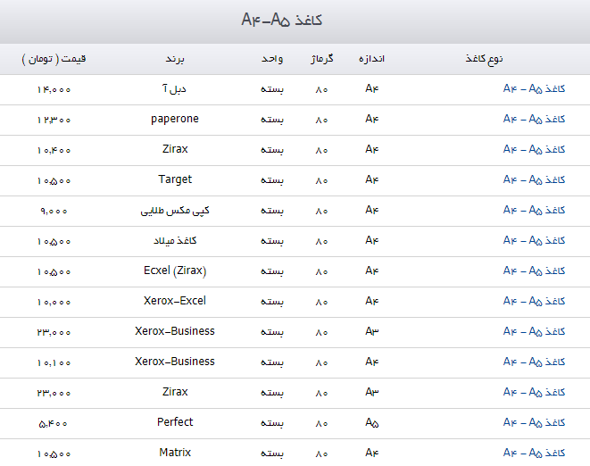به گزارش خبرنگار نبض بازار گروه اقتصادی باشگاه خبرنگاران جوان،  قیمت انواع کاغذ A4 و A5 در بازار به شرح زیر است:
