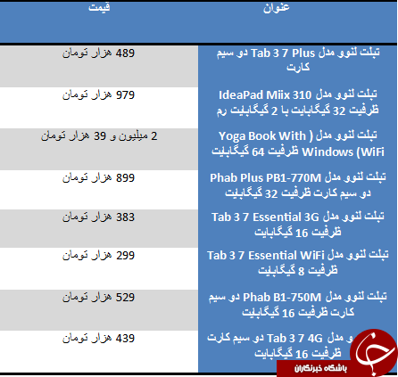 به گزارش خبرنگار نبض بازار گروه اقتصادی باشگاه خبرنگاران جوان، قیمت انواع تبلت های Lenovo در بازار به شرح زیر است: انتهای پیام/ آخرین قیمت تبلت لنوو در بازار