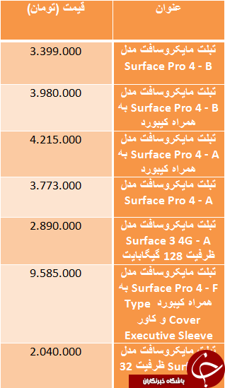 به گزارش خبرنگار نبض بازار گروه اقتصادی باشگاه خبرنگاران جوان، قیمت برخی از تبلت های مایکروسافت در بازار به شرح زیر است: انتهای پیام/ آخرین قیمت تبلت در بازار
