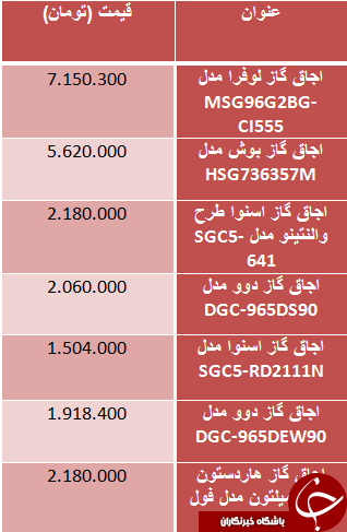 به گزارش خبرنگار نبض بازار گروه اقتصادی باشگاه خبرنگاران جوان، قیمت برخی از اجاق گاز ها در بازار به شرح زیر است: انتهای پیام/ آخرین قیمت اجاق گاز